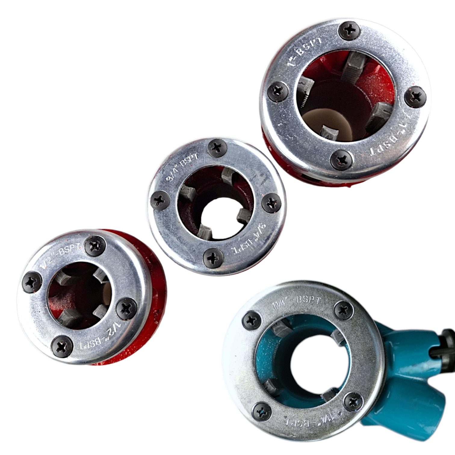 Каждая резьбонарезная головка имеет четыре отверстия для удаления стружки. Длинная ручка обеспечивает максимальное кручение при нарезании резьбы. Набор поставляется с пластиковой коробкой, что позволяет удобно транспортировать и хранить инструменты. Головки для нарезания резьбы изготовлены из чугуна, прочного и износостойкого. Резьбовая плашка: 1/2", 3/4", 1", 1-1/4" Тип резьбы: цилиндрическая трубная резьба 55 °.